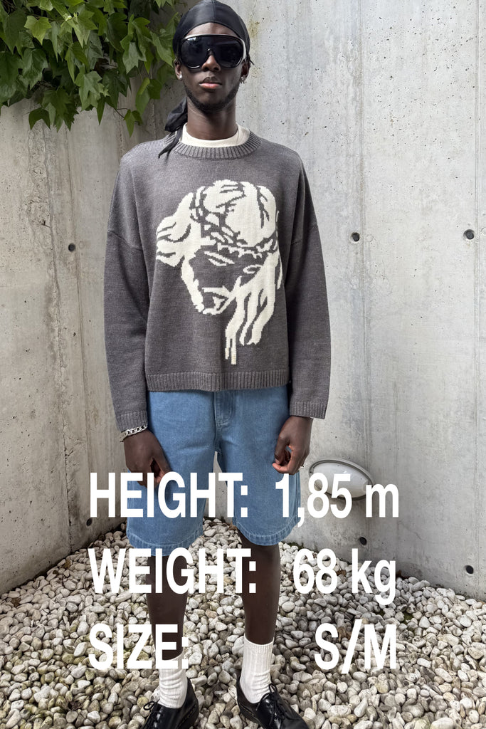 - White knitted Jesus piece on chest
